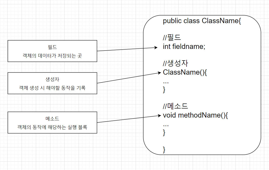 클래스의 구성 멤버로는 필드(field), 생성자(constructor), 메소드(method)가 있다.
