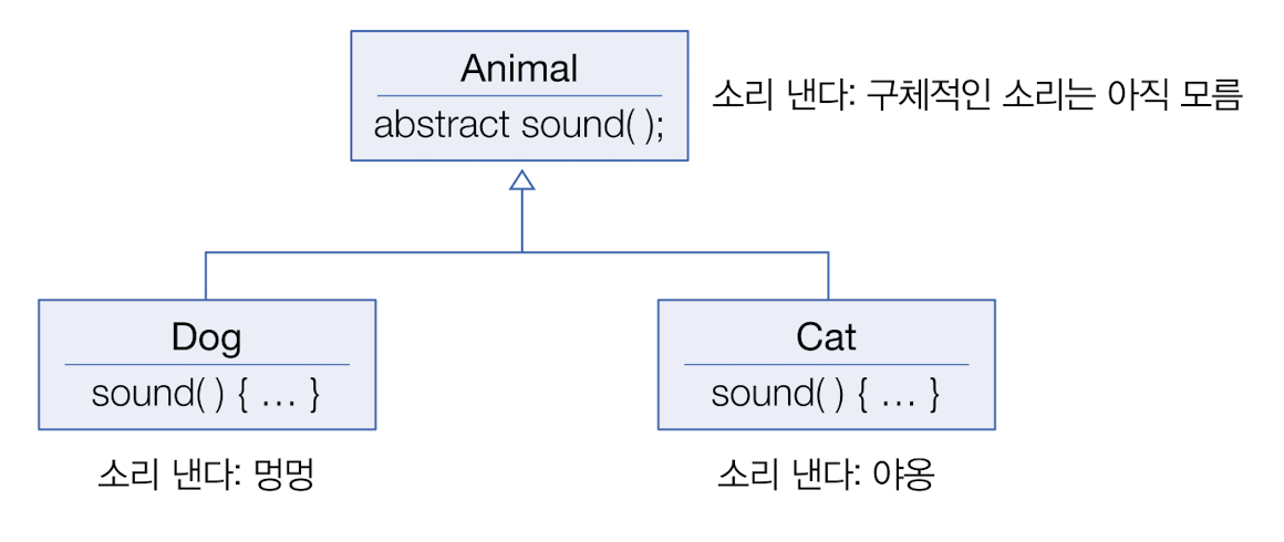예를 들어, 모든 동물은 소리를 내기 때문에 Animal 추상 클래스에서 sound()라는 메소드를 정의 했다고 가정하면, 어떤 소리를 내도록 해야하는데, 이것은 실체 클래스에서 직접 작성해야 될 부분이다.