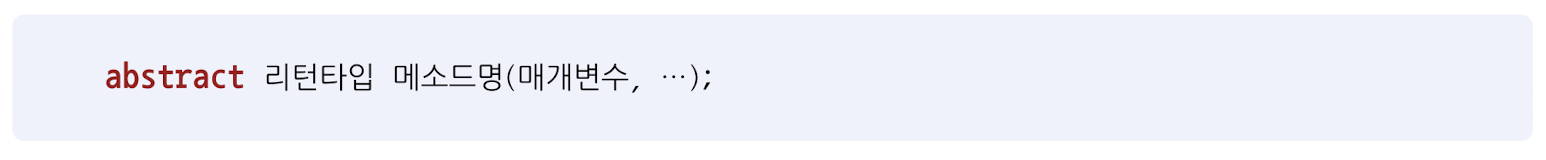 추상 메서드와 일반 메서드 선언과 차이점은 abstract 키워드가 붙고, 메서드 실행 내용인 중괄호 {} 가 없다.