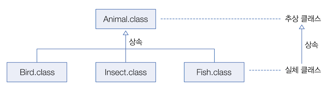 객체를 직접 생성할 수 있는 클래스를 실체 클래스라고 한다면 이 클래스들의 공통적인 특성을 추출해서 선언한 클래스를 추상 클래스라고 한다. 추상 클래스와 실체 클래스는 상속의 관계를 가지고 있다. 추상 클래스가 부모, 실체 클래스가 자식으로 구현되어 실체 클래스는 추상 클래스의 모든 특성을 물려받고, 추가적인 특성을 가질 수 있다.