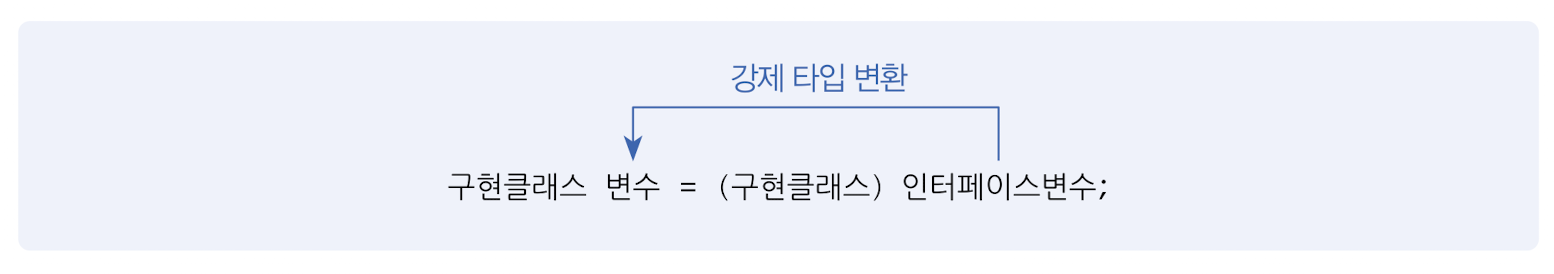 강제 타입 변환은 캐스팅 기호를 사용해서 인터페이스 타입을 구현 클래스 타입으로 변환시키는 것을 말한다.