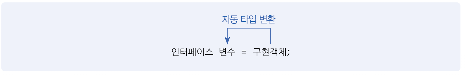 자동차를 설계할 때 다음과 같이 필드 타입으로 타이어 인터페이스를 선언하면 필드값으로 한국 타이어 또는 금호 타이어 객체를 대입할 수 있다. 자동 타입 변환 때문이다.