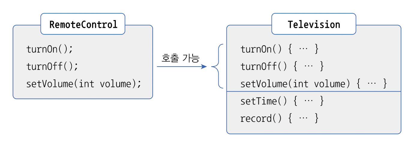 RemoteControl 인터페이스에는 3개의 메서드, Television 클래스에는 5개의 메서드가 선언되어 있다면 RemoteControl 인터페이스로 호출 가능한 메서드는 3개뿐이다.