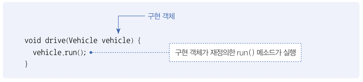 운전자 클래스인 Driver는 다양한 Vehicle 구현 객체를 운전하기 위해 Vehicle 인터페이스를 매개변수로 가지는 drive() 메서드를 아래와 같이 선언했다.