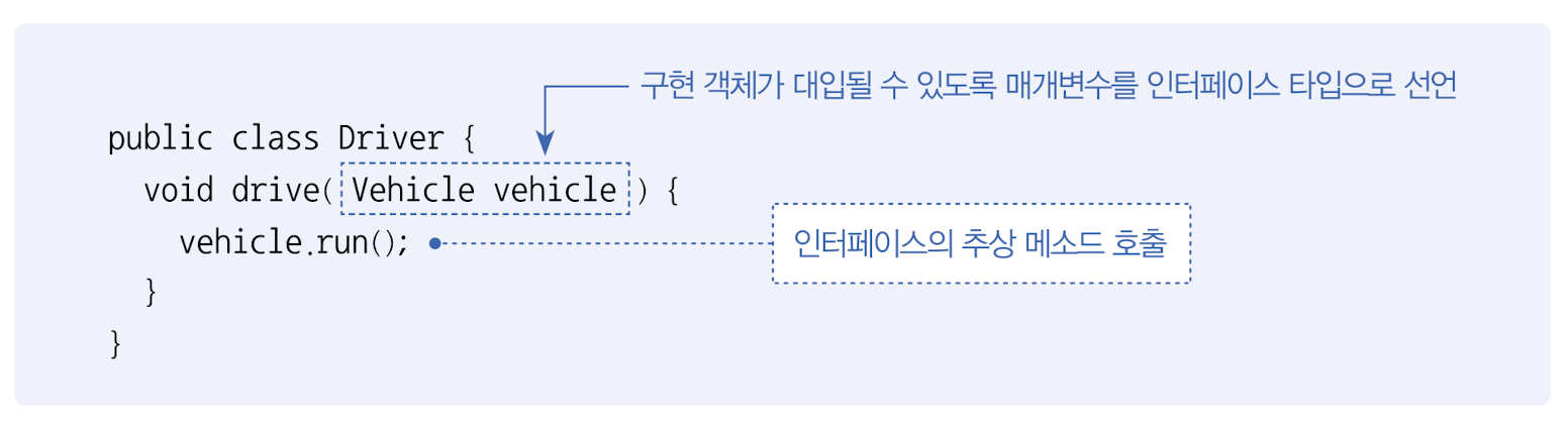 비슷한 원리로 매개변수 타입을 인터페이스로 선언하면 메서드 호출 시 다양한 구현 객체를 대입할 수 있다.