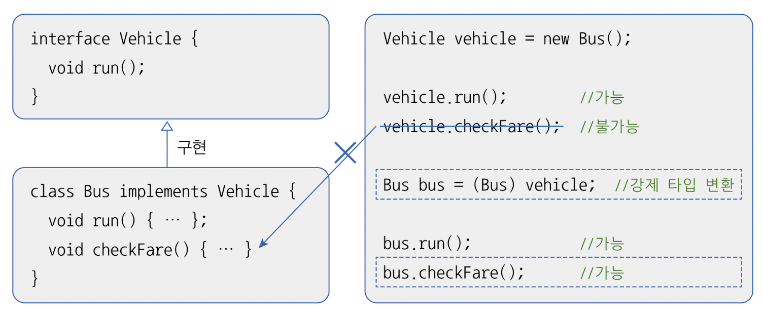 또 다른 예로, Vehicle 인터페이스를 구현한 Bus를 Vehicle로 자동 타입변환하면 checkFare() 메서드를 호출할 수 없지만, 강제 타입 변환해서 Bus로 변환하면 호출이 가능해진다.