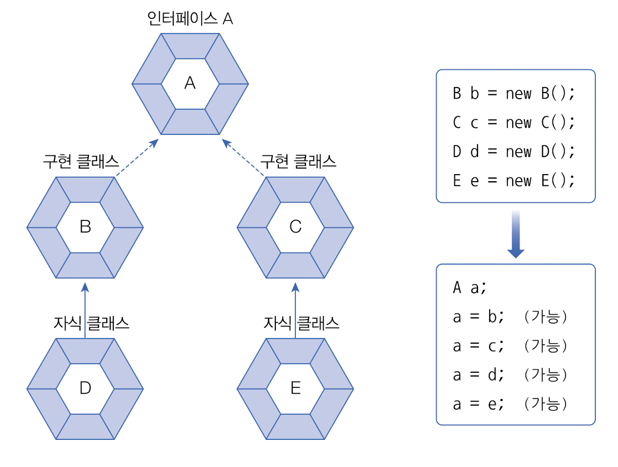 B, C, D, E로 부터 생성된 객체는 모두 인터페이스 A로 자동 타입 변환될 수 있다. 모두 인터페이스 A를 직접 또는 간접적으로 구현하고 있기 때문이다.
