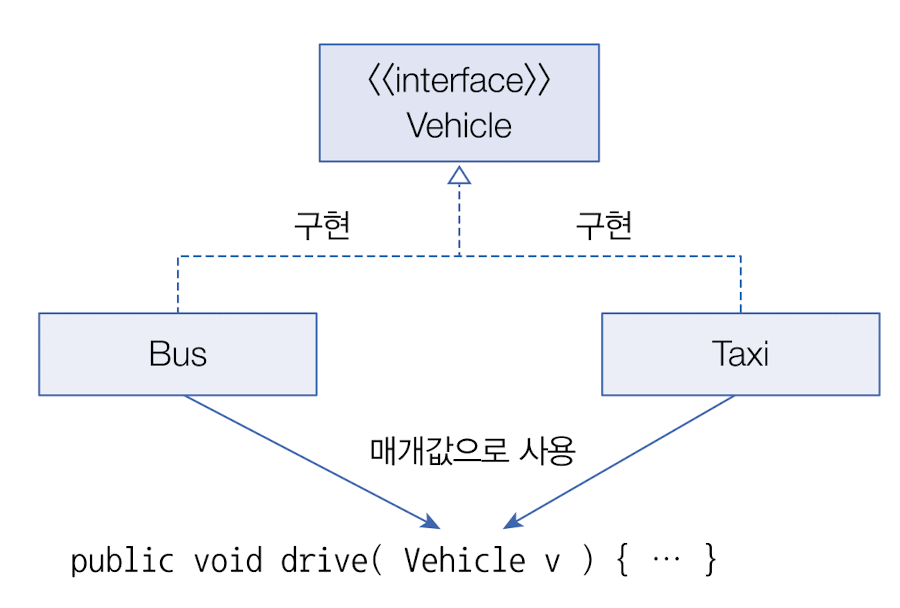 운전자 클래스인 Driver는 다양한 Vehicle 구현 객체를 운전하기 위해 Vehicle 인터페이스를 매개변수로 가지는 drive() 메서드를 아래와 같이 선언했다.