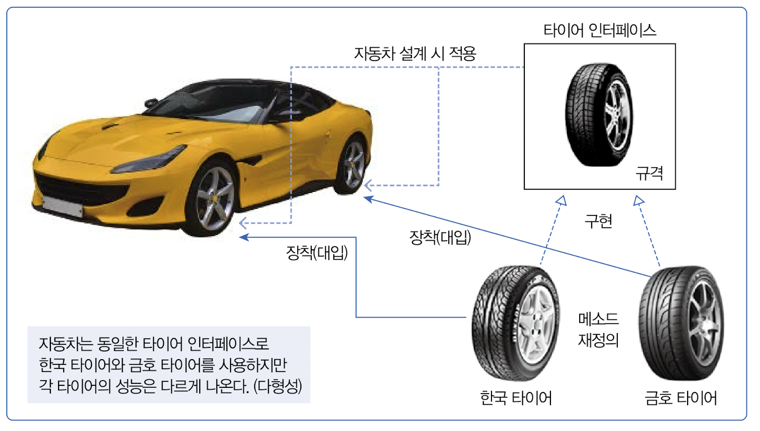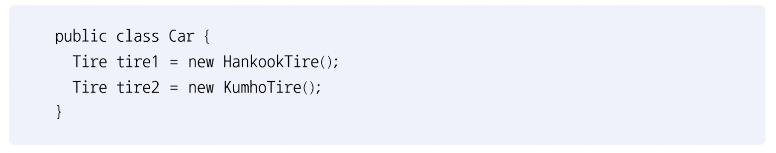 Car 객체를 생성한 후 다른 구현 객체를 대입할 수도 있다. 이것이 타이어 교체에 해당된다.