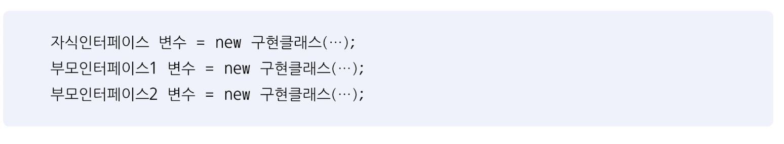 구현 객체가 자식 인터페이스 변수에 대입되면 자식 및 부모 인터페이스의 추상 메서드를 모두 호출할 수 있으나, 부모 인터페이스 변수에 대입되면 부모 인터페이스에 선언된 추상 메서드만 호출이 가능하다.
