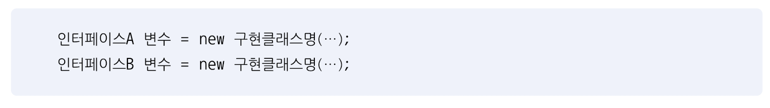 인터페이스 A와 인터페이스 B를 구현한 객체는 다음과 같이 두 인터페이스 타입의 변수에 각각 대입될 수 있다.