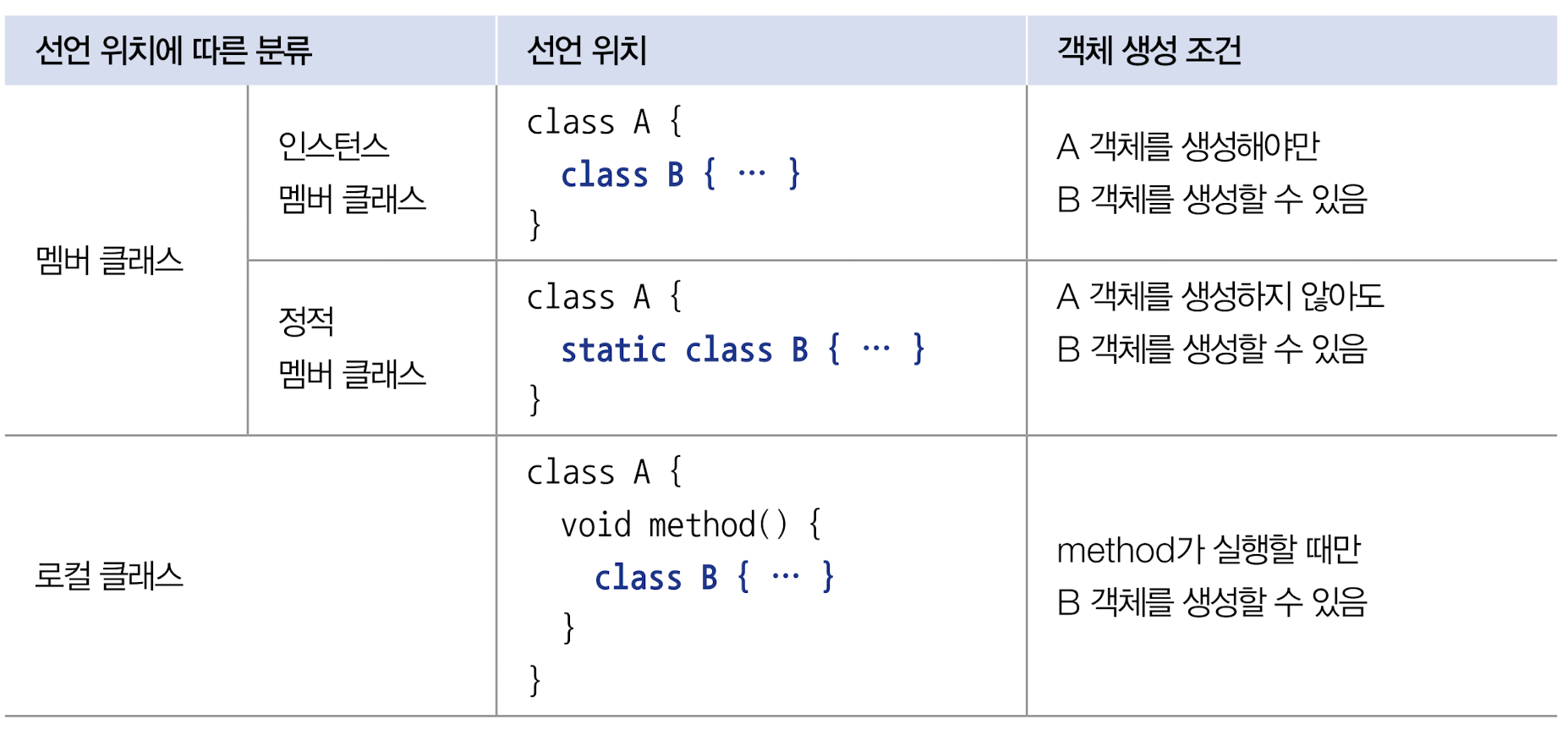 멤버 클래스 내부에서 바깥 클래스의 필드와 메소드에 접근할 때는 제한이 따른다. 또한 메소드의 매개 변수나 로컬 변수를 로컬 클래스에서 사용할 때도 제한이 따른다.
