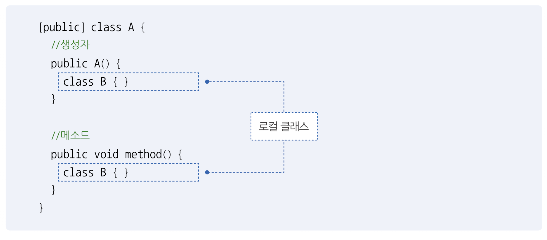- 로컬 클래스 : 생성자 또는 메소드 내부에서 선언되는 중첩 클래스