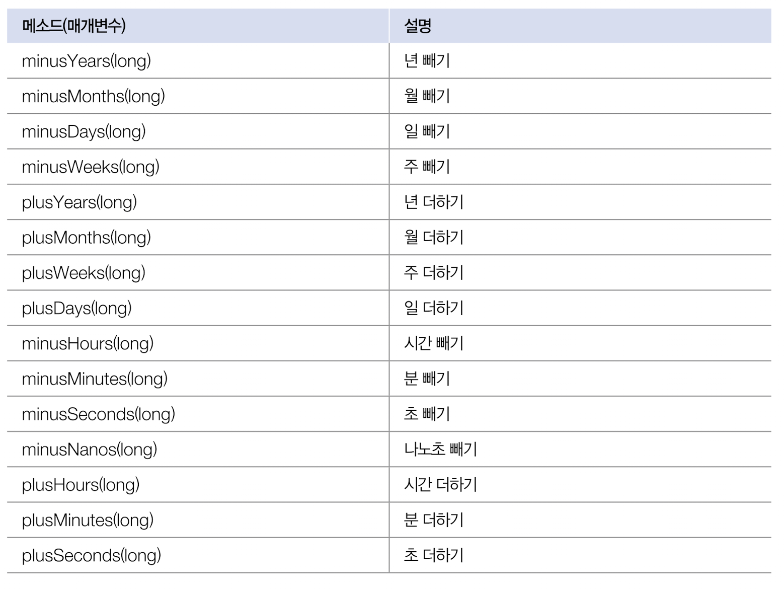 이때는 java.time 패키지의 LocalDateTime 클래스가 제공하는 다음 메소드를 이용하면 매우 쉽게 날짜와 시간을 조작할 수 있다.