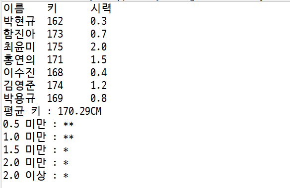 평균 키와 시력 분포를 출력하는 예제 코드이다.