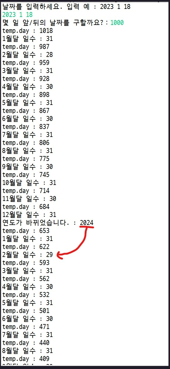 arr의 행에 오는 isLeap()메소드는 temp의 연도가 윤년이면 1, 평년이면 0을 리턴한다. 열에오는 temp의 month에 -1을 한 이유는 배열의 인덱스는 0부터 시작하기 때문이다. 2023.01.18에 1000일을 한 temp객체는 초기에 2023.01.1018로 되어있다. while루프는 temp의 day가 달의 일수보다 같거나 작을 때 까지 반복한다. day는 루프를 돌면서 계속 달의 일수만큼 감소된다. 달의 일수가 감소할 때, 달은 계속 증가하게 되고, 달이 12를 넘어가면 연도를 +1해준다.