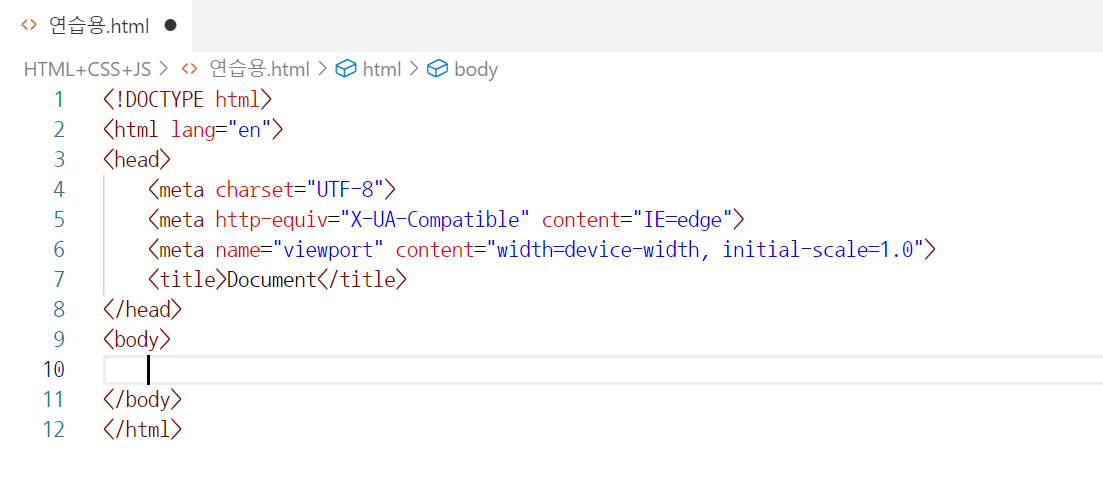 아래와 같이 자동으로 기본적인 HTML 문서 구조가 완성된다.