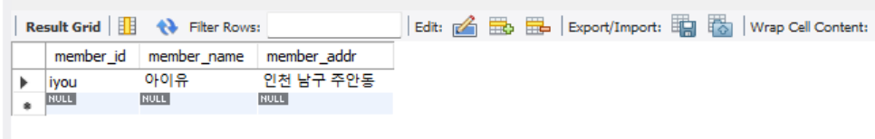 where에 member_name이 아이유인 사람만 추출해 달라는 코드이다.