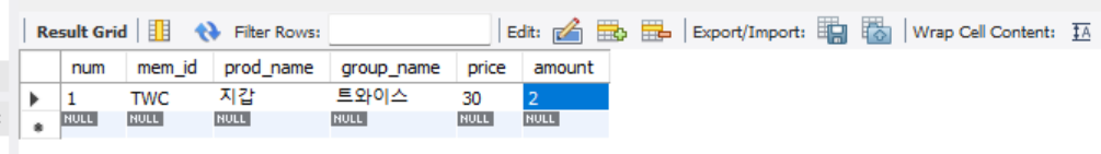 insert into buy values(null, 'TWC', '지갑', '트와이스', 30, 2); -- 데이터 삽입