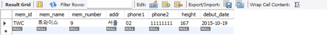 insert into member values('TWC', '트와이스', 9, '서울', '02', '11111111', 167, '2015,10,19'); -- 데이터 삽입