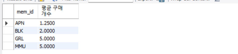 SELECT mem_id, AVG(amount) "평균 구매 개수"