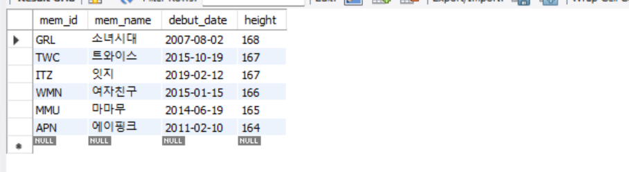 member 테이블에서 데뷔일자가 빠른 순서대로 출력하려면 아래처럼 작성한다.