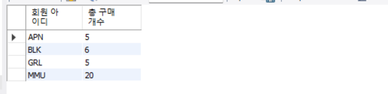 SELECT mem_id "회원 아이디", SUM(amount) "총 구매 개수"