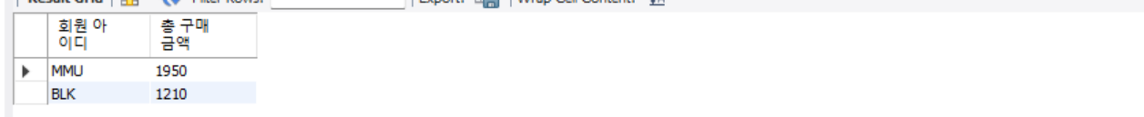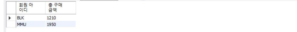 SUM()으로 회원별 총구매액을 구하면 아래와 같다.