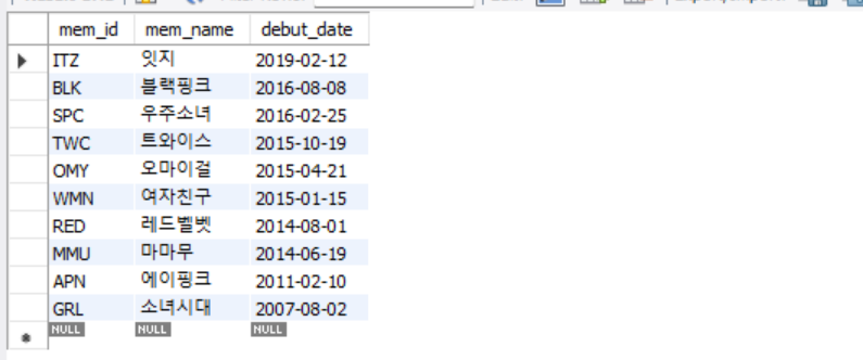 member 테이블에서 데뷔일자가 빠른 순서대로 출력하려면 아래처럼 작성한다.