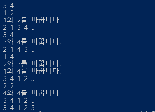 cout << arr[j + a - 1] << "와 " << arr[b - j - 1] << "를 바꿉니다." << endl;