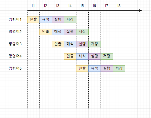 이처럼 공장 생산 라인과 같이 명령어들을 명령어 파이프라인에 넣고 동시에 처리하는 기법을 명령어 파이프라이닝이라고 한다.