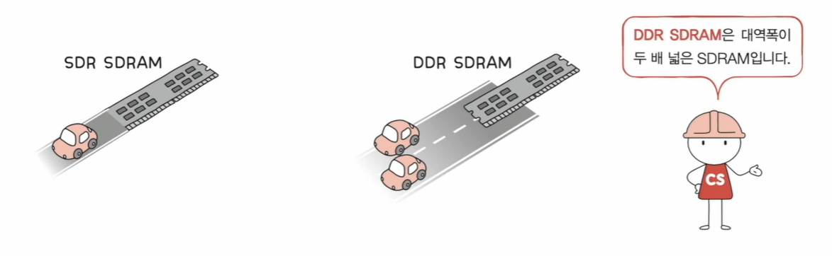- 대역폭을 넓혀 속도를 빠르게 만든 SDRAM이다.