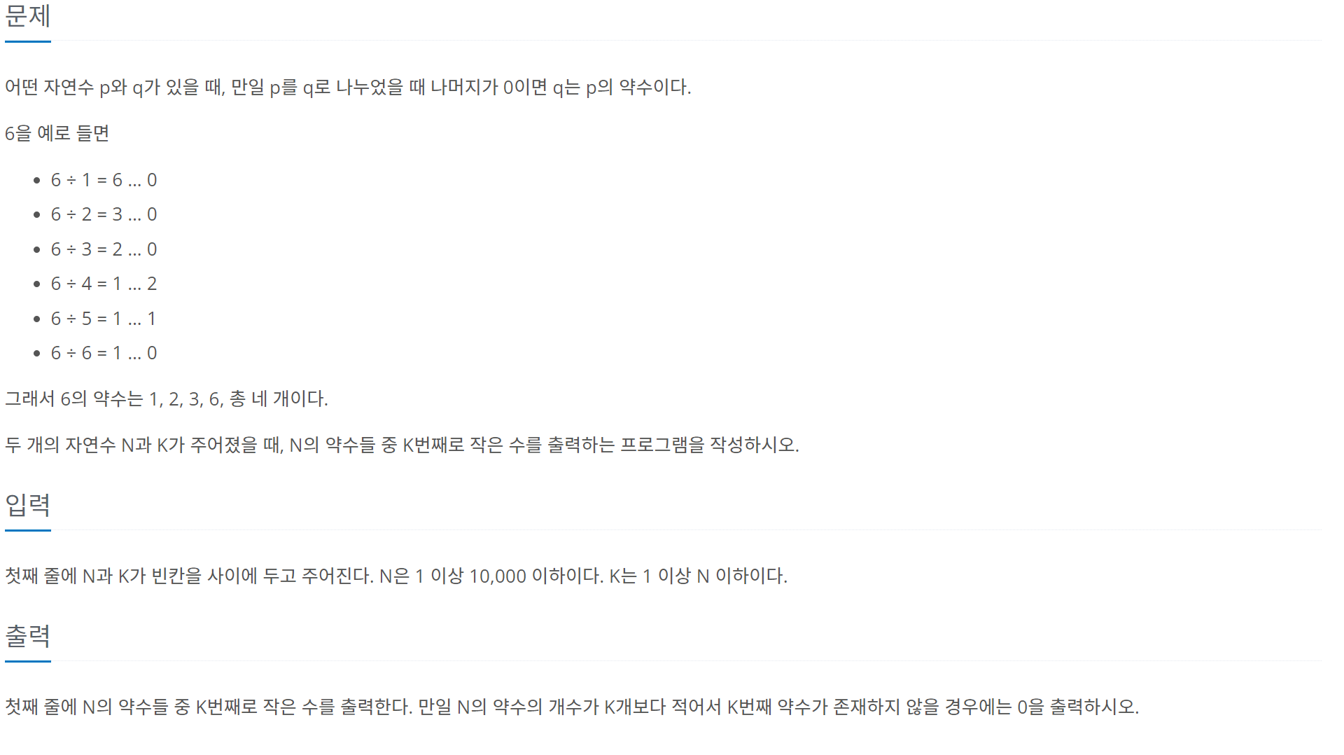 - N을 i로 나누었을 때 나머지가 0이면 arr[count]에 i를 대입시키고 i를 증가시킴(배열에는 약수가 작은 순서대로 들어감)