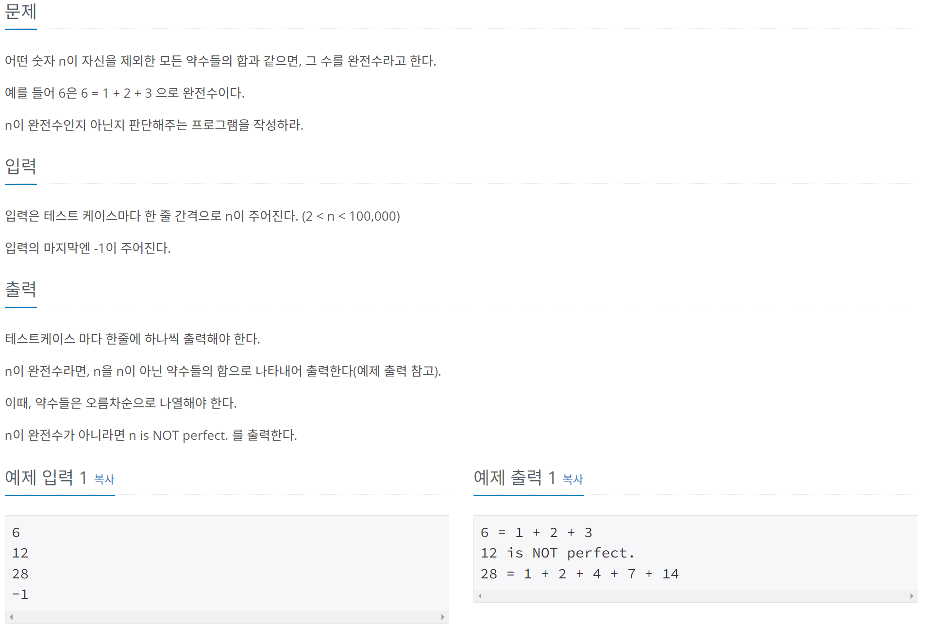 - 약수들의 합과 N이 같다면 완전수이므로 출력 형식대로 출력한다.