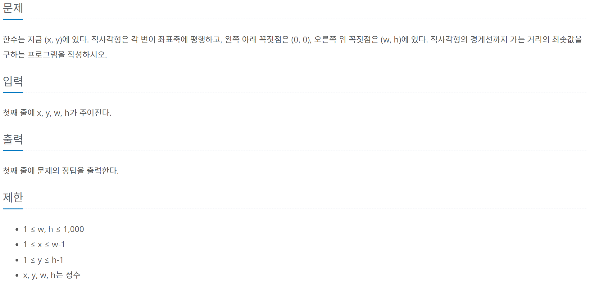 [C++] 백준 10단계 - 1085번 문제 (직사각형에서 탈출)자료구조 & 알고리즘/BOJ2023. 5. 15. 22:48