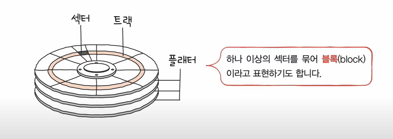 - 플래터(platter) : 자기 물질로 덮여 있어 수많은 N극과 S극을 저장한다. N극과 S극은 0과 1의 역할을 수행한다.