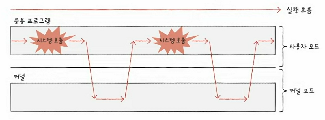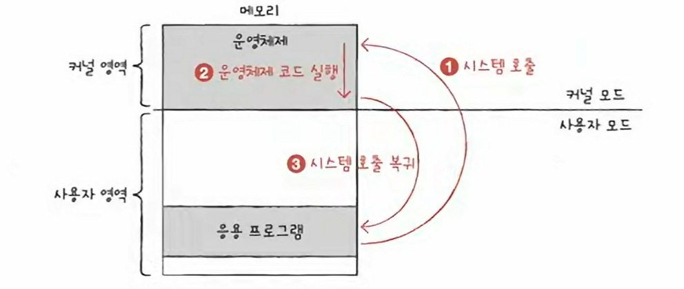사용자 모드로 실행되는 프로그램이 자원에 접근하는 운영체제 서비스를 제공받으려면 운영체제에 요청을 보내 커널 모드로 전환되어야 한다.