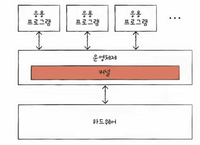 마찬가지로 운영체제가 응용 프로그램에 제공하는 서비스 종류는 다양하지만, 그중에서도 가장 핵심적인 서비스들이 있다. 이러한 운영체제의 핵심 서비스를 담당하는 부분을 커널(kernel)이라고 한다.