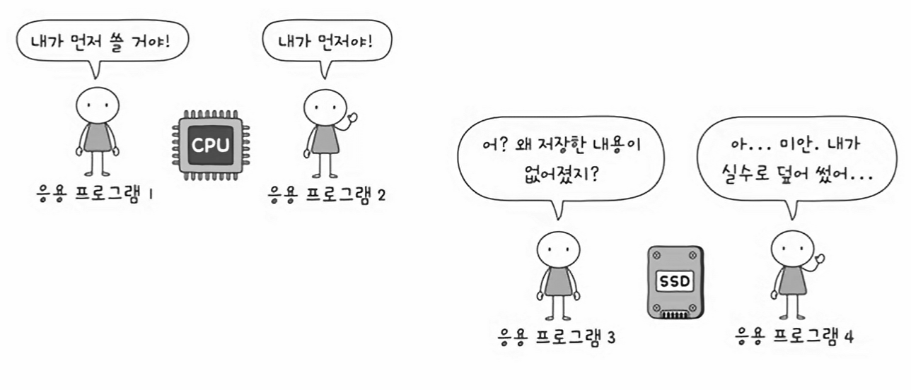 만약 운영체제의 개입 없이, 응용 프로그램이 마음대로 CPU, 메모리, 하드디스크등의 자원을 쓴다면 자원이 무질서하게 관리될 것이고, 응용 프로그램이 조금만 실수해도 컴퓨터 전체에 큰 악영향을 끼칠 수 있다.