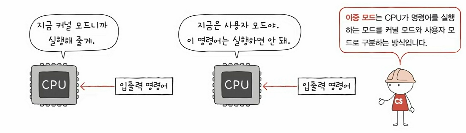 이중 모드(dual mode)란 CPU가 명령어를 실행하는 모드를 크게 사용자 모드와 커널 모드로 구분하는 방식이다.