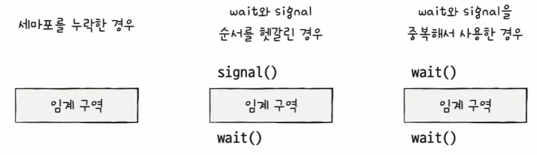 - 세마포를 누락하거나, wait와 signal함수 호출 순서를 헷갈린 경우, 중복해서 사용한 경우 예기치 못한 결과를 얻을 수 있다.