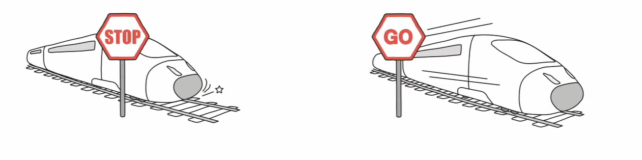 기차는 신호기가 내려가 있을 때는 '멈춤' 신호로 간주하고 잠시 멈춘다.