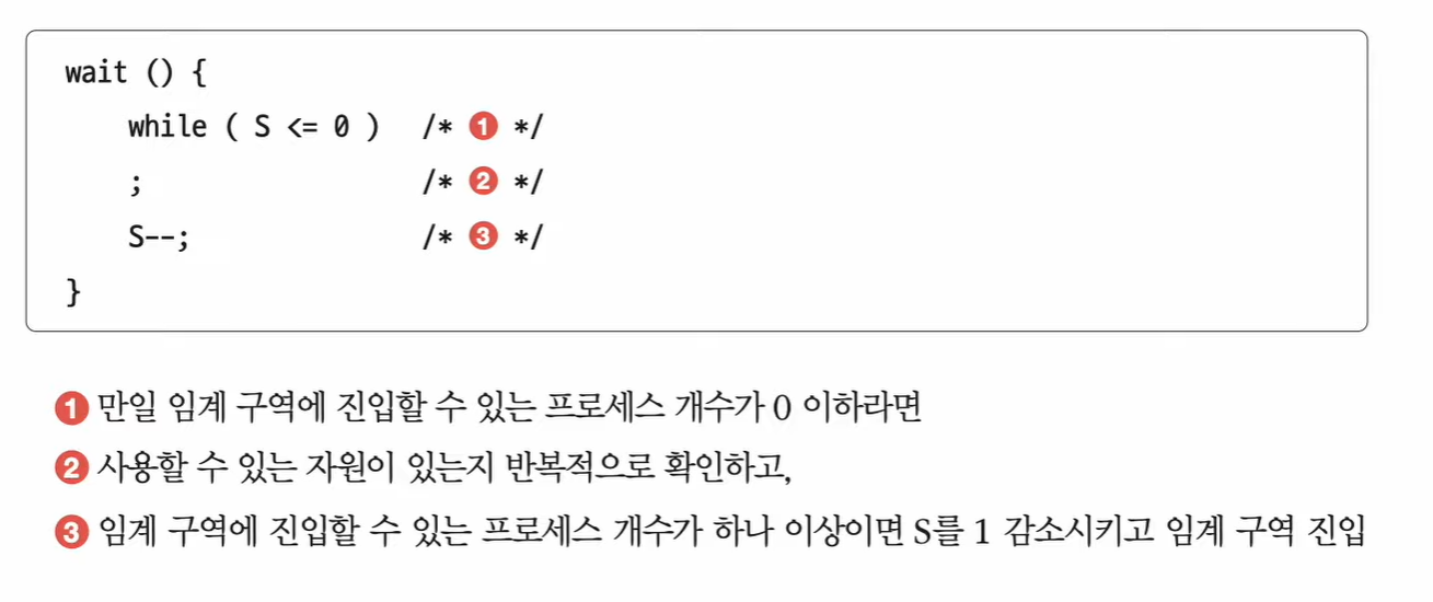 - 전역 변수 S : 임계 구역에 진입할 수 있는 프로세스의 개수(사용 가능한 공유 자원의 개수)를 나타냄