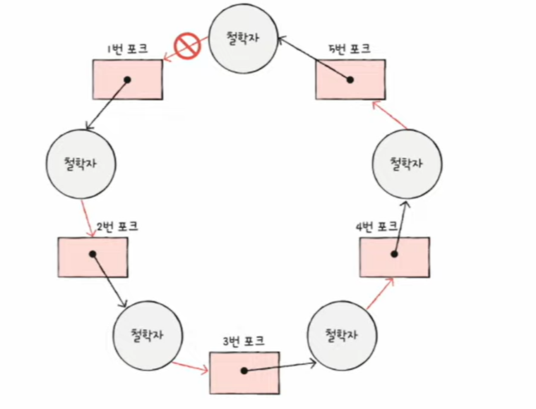 왜냐하면 5번 포크를 집어들고 1번 포크를 집어들 수 없기 때문이다.