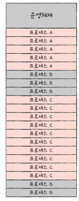 아래의 그림처럼 메모리와 프로세스를 일정한 단위로 자르고, 이를 메모리에 불연속적으로 할당할 수 있다면 외부 단편화는 발생하지 않는다.