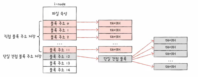 - i-node에는 파일 속성 정보와 열다섯 개의 블록 주소가 저장될 수 있다.