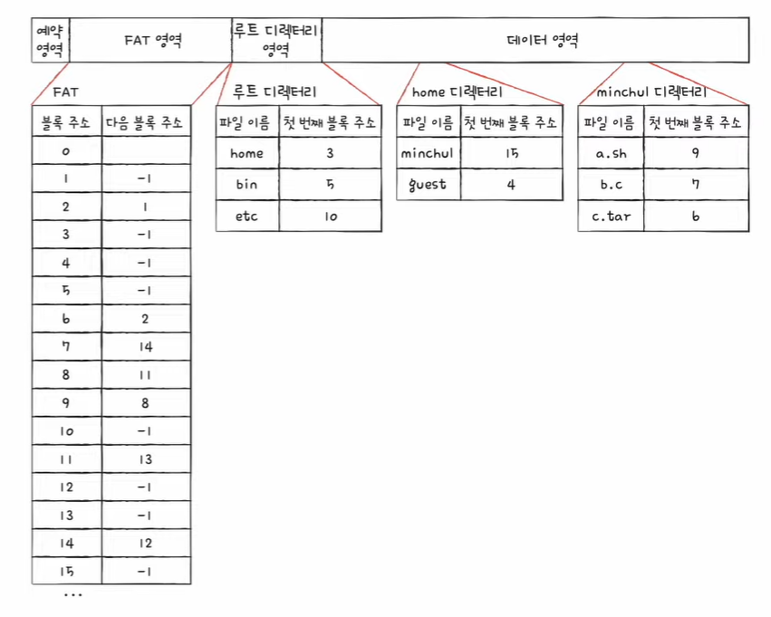 - 각 블록에 포함된 다음 블록 주소를 한 곳에 모아 테이블(FAT:File Allocation Table)로 관리