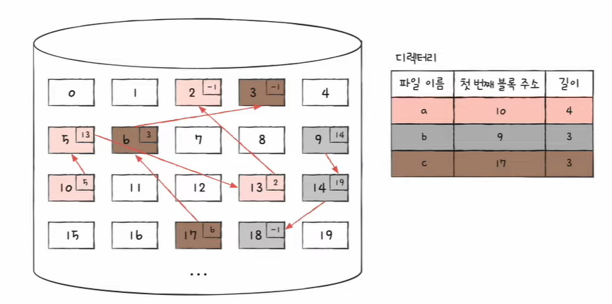- 파일을 이루는 데이터 블록을 연결 리스트로 관리