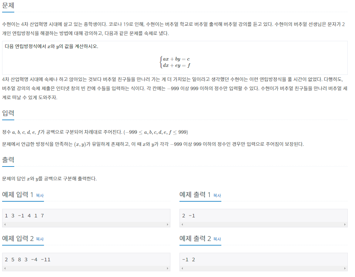 [C++] 백준 12단계 - 19532번 문제 (수학은 비대면강의입니다)자료구조 & 알고리즘/BOJ2023. 7. 10. 18:19
