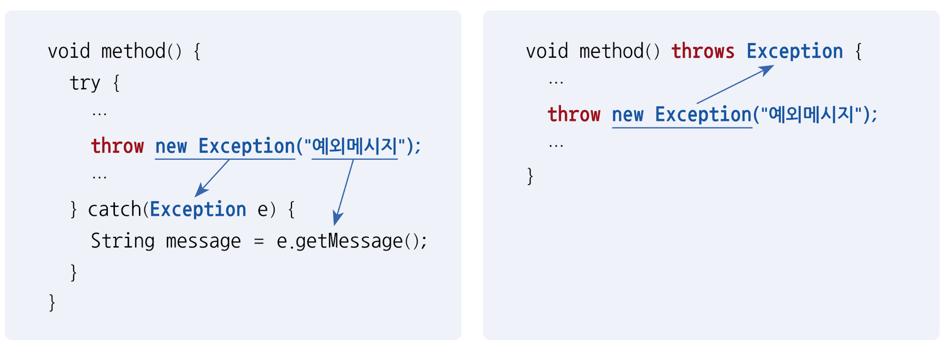 - 자바에서 제공하는 표준 예외뿐만 아니라 사용자 정의 예외를 직접 코드에서 발생시키려면 throw 키워드와 함께 예외 객체를 제공하면 된다.
